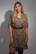 Εντυπωσιακό φόρεμα σε animal print σχέδιο που αναδεικνύει τη θηλυκότητα και το στυλ σου. Διαθέτει μακριά μανίκια με κουμπί στο ύψος του αγκώνα, ώστε να μπορείς να τα φοράς είτε κατεβασμένα είτε γυρισμένα για διαφορετικά look. Συνοδεύεται από αποσπώμενη ζώνη μέσης σε μαύρο χρώμα με χρυσή αγκράφα, που τονίζει όμορφα τη σιλουέτα. Έχει χαλαρή γραμμή, άνετη εφαρμογή και μήκος που φτάνει περίπου λίγο πιο πάνω από το γόνατο, με ελαφρώς μακρύτερο πίσω μέρος για extra κομψότητα.