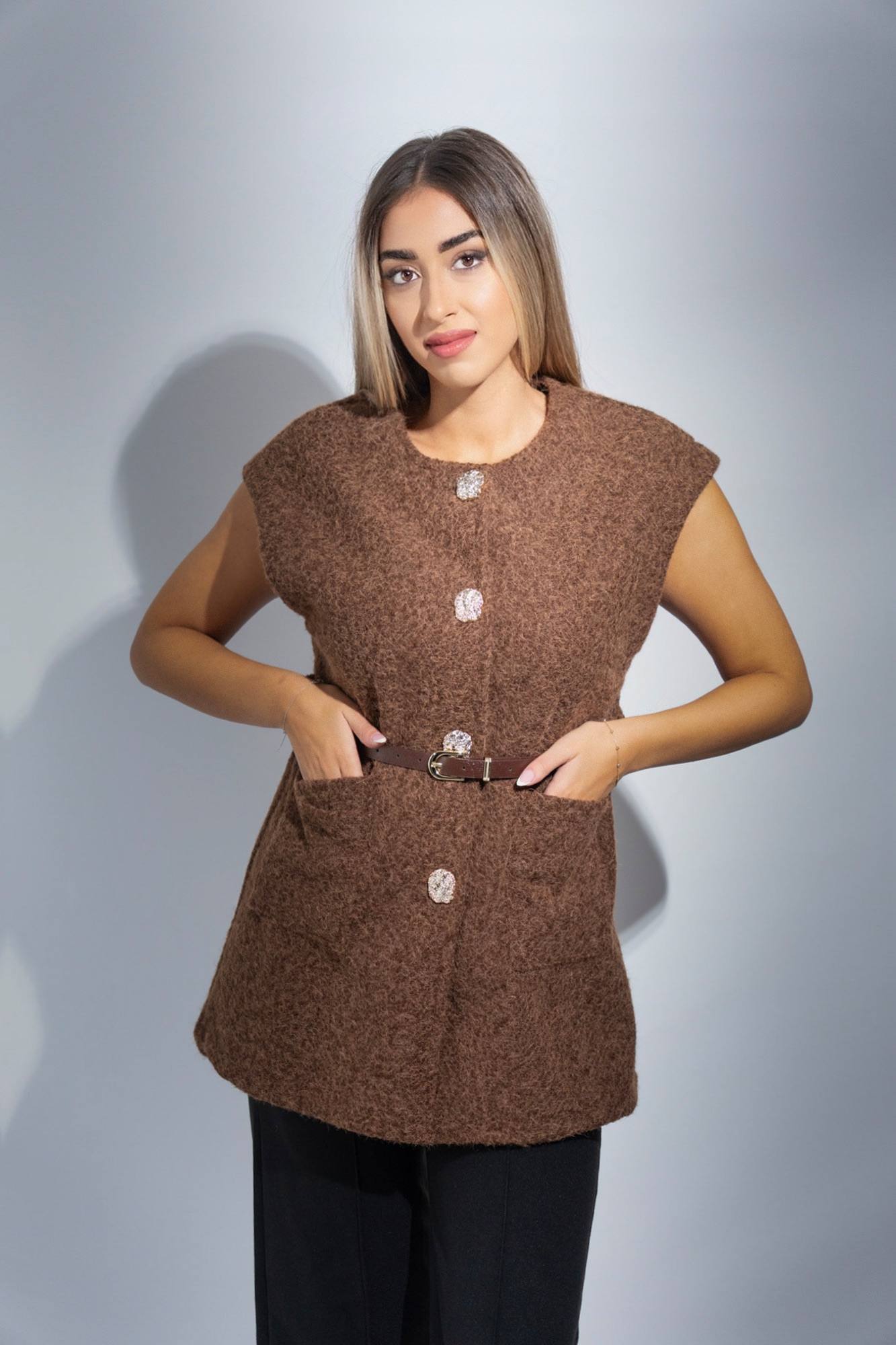 Αναβάθμισε το στυλ σου με αυτό το υπέροχο μπουκλέ γιλέκο, που συνδυάζει άνεση και κομψότητα. Διαθέτει τσέπες, κομψή ζώνη που αναδεικνύει τη μέση, και εντυπωσιακά κουμπιά που του χαρίζουν μια ιδιαίτερη πινελιά πολυτέλειας.
