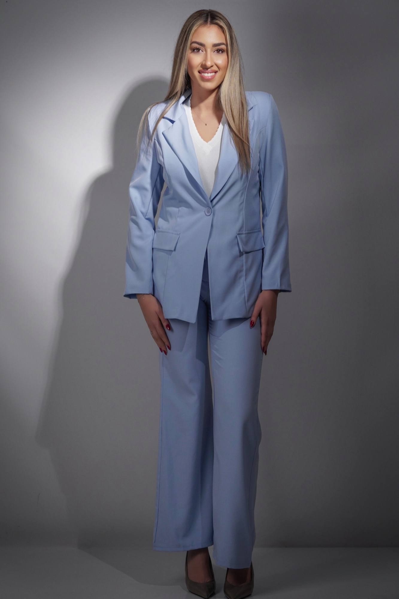 Αναδείξτε τη θηλυκότητα και την κομψότητά σας με αυτό το εντυπωσιακό κοστούμι. Το σακάκι διαθέτει κλασική γραμμή με διακριτικό κούμπωμα, χαρίζοντας ένα chic και διαχρονικό αποτέλεσμα που ταιριάζει από το πρωί έως το βράδυ.